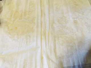 Am avut în pachet 15 foi de plăcintă, așa că am ales să fac 5 rulouri, a câte 3 foi. Am întins câte o foaie de plăcintă, am uns-o cu unt topit, apoi am așezat următoarea foaie pe care, de asemenea, am uns-o cu unt și după aceea am așezat ultima foaie din rulou, peste care am așezat umplutura.